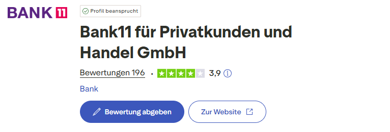 Die Bank11 für Privatkunden und Handel GmbH verfügt auf Trustpilot.com über insgesamt 196 Bewertungen. Die Durchschnittsnote ist 3,9 und gut. Für eine Bank, die ausschließlich Kredite anbietet ist diese Note als sehr gut zu bewerten. Zudem erfolgen die Bewertungen freiwillig und nicht auf vorherige Einladung.
